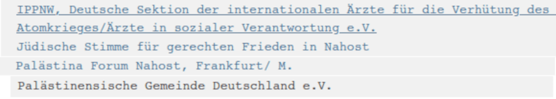 und Matthias Jocheim vom IPPNW und bis 2022-23 Ratsmitglied von Attac, – „das sich für eine friedliche Gestaltung der Globalisierung einsetzt.“ (1)“ führt das Frankfurter PalästinaForum an.