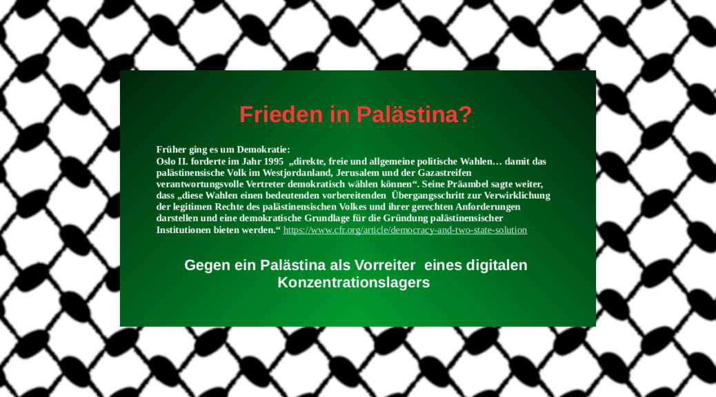 Oslo II. forderte im Jahr 1995 „direkte, freie und allgemeine politische Wahlen… damit das palästinensische Volk im Westjordanland, Jerusalem und der Gazastreifen verantwortungsvolle Vertreter demokratisch wählen können“. Seine Präambel sagte weiter, dass „diese Wahlen einen bedeutenden vorbereitenden Übergangsschritt zur Verwirklichung der legitimen Rechte des palästinensischen Volkes und ihrer gerechten Anforderungen darstellen und eine demokratische Grundlage für die Gründung palästinensischer Institutionen bieten werden.“ https://www.cfr.org/article/democracy-and-two-state-solution