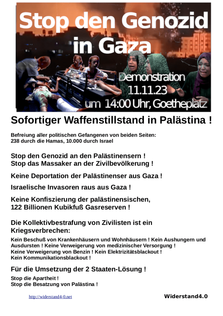 Der Startpunkt unserer Demonstration am Goetheplatz wurde heute vom Ordnungsamt bestätigt. Unser Widerspruch hatte Erfolg. Der Versuch des Ordnungsamt diesen kurzfristig zu ändern, kam nicht durch. Das Ordnungsamt zeigte auch sein Unverständnis über das Verhalten der Polizei, die auf der Demo am Freitag , den 3.11.23 ein Transparent mit dem Titel Genozid und das Verteilen unseres Flugblatt verboten hatte .