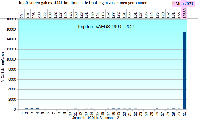 In nur 9 Monaten bis zum 15.Sept 2021 gab es in den USA 3,5 mal so viele Impftote (Covid 19- Impfungen) wie in 30 Jahren Tote aller Impfungen zusammen. Es handelt sich um 94 Impfstoffe , deren Tote zusammenaddiert wurden. Tödliche Reaktionen kommen bei Impfungen normalerweise sehr selten vor. Bei der Schweinegrippe wurde das Impfprogramm bei 53 Toten abgebrochen. Damals hafteten die Impfhersteller noch für die Schäden. Das ist heute nicht mehr der Fall.