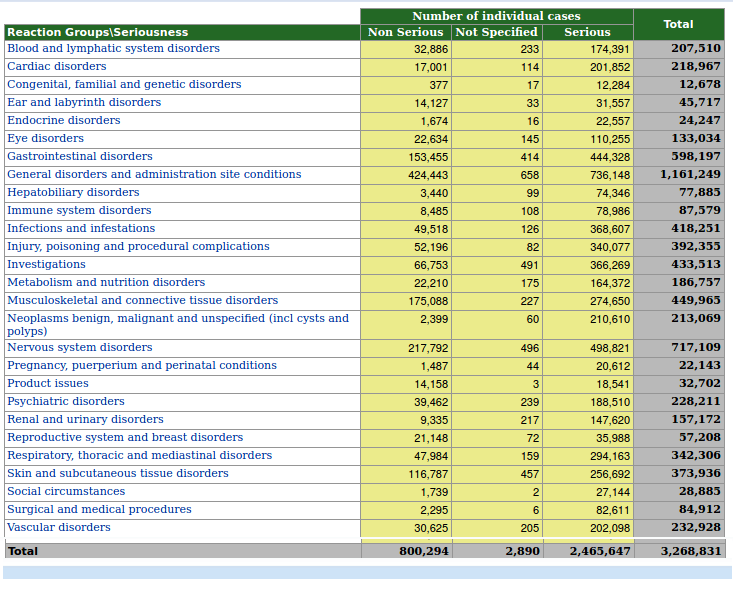 Von seltenen Fällen kann bei 2.465.687 schweren Erkrankungen in Europa bis zum 11.9.2021.keine Rede sein. In den USA gab es laut VAERS 99.410 schwere Erkrankungen bis zum 17. Sept 21 (die große Differenz in den Daten ist vermutlich auf die unterschiedliche Meldehäufigkeit in USA und Europa zurückzuführen).