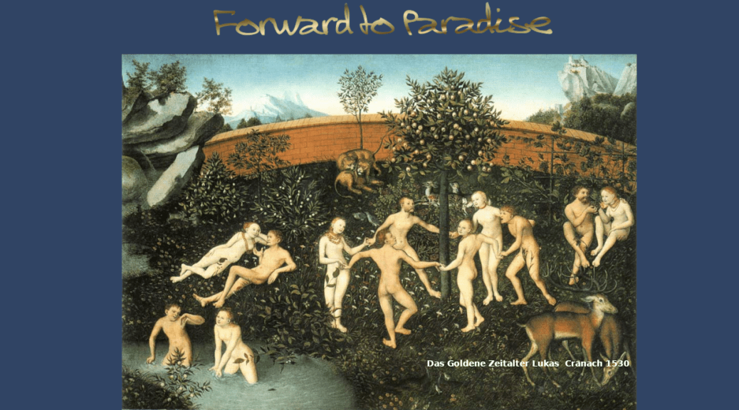 Was in der Antike als Erinnerung an ein Goldenes Zeitalter vor dem Einbruch des Patriarchats vorhanden war , wurde später in den monotheistischen Religionen in den Mythos des Paradieses transportiert, aus dem die Menschen durch den Sündenfall vertrieben worden seinen, dargestellt in der Trilogie des Hyronimus Bosch .https://de.wikipedia.org/wiki/Der_Garten_der_L%C3%BCste_(Bosch)